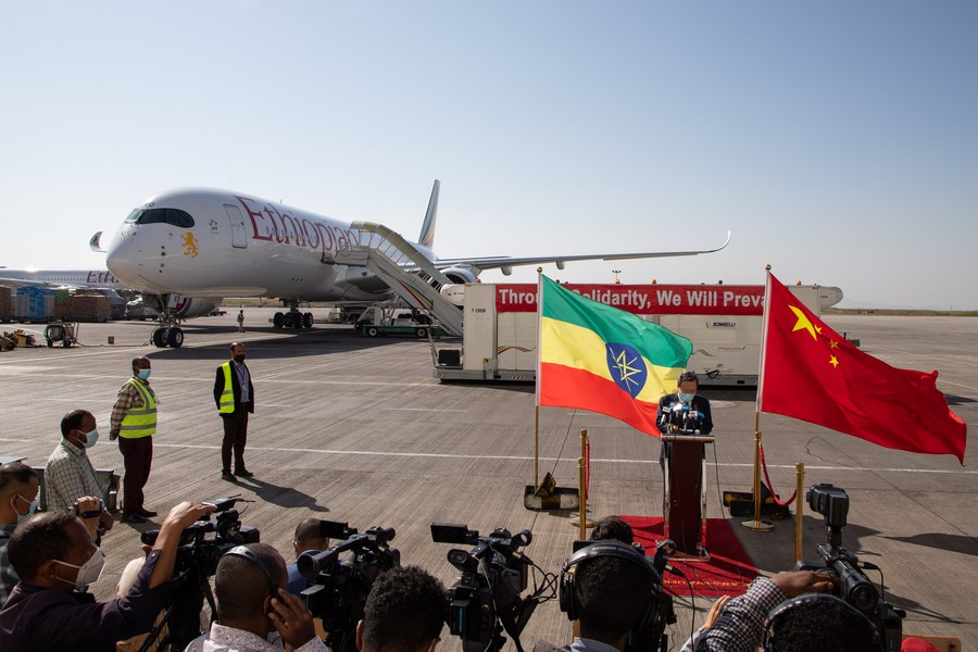 A handover ceremony for Chinese-donated COVID-19 vaccines is held in Addis Ababa, Ethiopia, on Oct. 24, 2021. (Xinhua/Michael Tewelde)