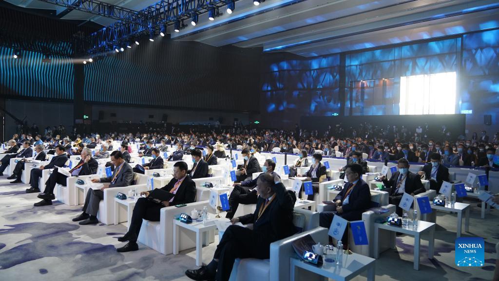 Photo taken on Nov. 1, 2021 shows the opening ceremony of the 4th World Laureates Forum in east China's Shanghai. The 4th World Laureates Forum kicked off Monday in Shanghai, gathering more than 130 decorated scientists, including 68 Nobel Prize winners, to attend the three-day forum. Centering on the theme "Open science: build an open innovation ecosystem," this year's forum will host nearly 100 conferences and activities in 14 sections, covering a number of basic disciplines such as chemistry, physics, life science and mathematics. (Xinhua/Yang Youzong)
