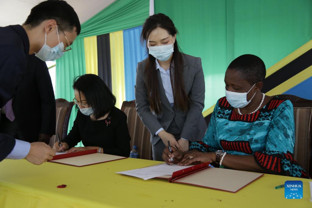 Tanzanian Minister for Health, Community Development, Gender, Elderly and Children Dorothy Gwajima (R) signs documents after receiving COVID-19 vaccines from China in Dar es Salaam, Tanzania, on Nov. 1, 2021. Tanzania on Monday received the second batch of 500,000 Sinopharm vaccine doses from China, boosting the east African nation's drive to vaccinate its people against the COVID-19 pandemic. (Photo by Herman Emmanuel/Xinhua)