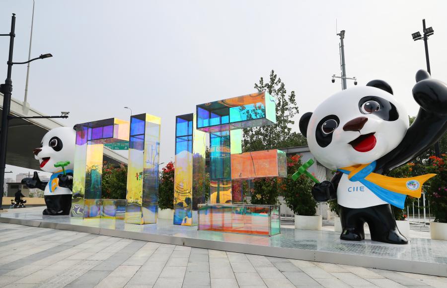 Photo taken on Oct. 22, 2021 shows decorative installations near the National Exhibition and Convention Center (Shanghai), a main venue for the fourth CIIE, in east China's Shanghai. (Xinhua/Fang Zhe)