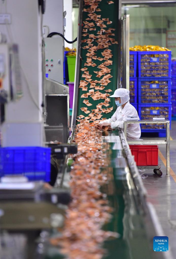 Workers pack Luosifen rice noodles at a food-processing company in Liuzhou, south China's Guangxi Zhuang Autonomous Region, Nov. 1, 2021. Luosifen companies in Liuzhou are working at full capacity to prepare enough stock for the upcoming "Double Eleven" online shopping festival. Liuzhou Luosifen, a soup dish dubbed by some people as "durian of soup" for its strong smell, features rice vermicelli soaked in a spicy broth flavored by river snails and topped with ingredients including pickled bamboo shoots, string beans, peanuts and tofu skin. (Xinhua/Huang Xiaobang)