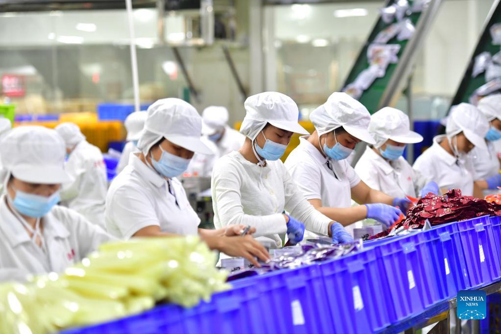 Workers pack Luosifen rice noodles at a food-processing company in Liuzhou, south China's Guangxi Zhuang Autonomous Region, Nov. 1, 2021. Luosifen companies in Liuzhou are working at full capacity to prepare enough stock for the upcoming "Double Eleven" online shopping festival. Liuzhou Luosifen, a soup dish dubbed by some people as "durian of soup" for its strong smell, features rice vermicelli soaked in a spicy broth flavored by river snails and topped with ingredients including pickled bamboo shoots, string beans, peanuts and tofu skin. (Xinhua/Huang Xiaobang)