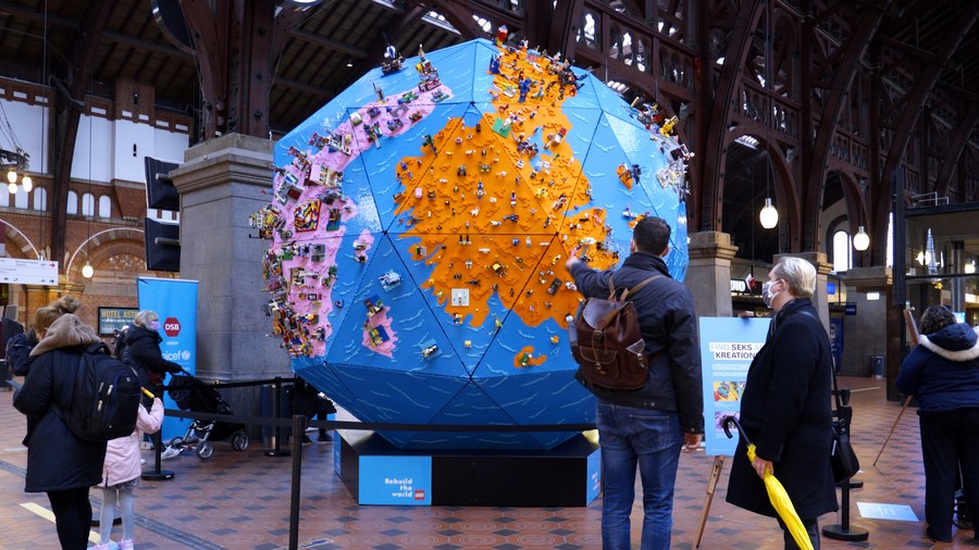 Commuters view an enormous colorful globe constructed from LEGO bricks at the Central Station in the Danish capital Copenhagen, on Nov. 20, 2020. (Xinhua/Anders Kongshaug)