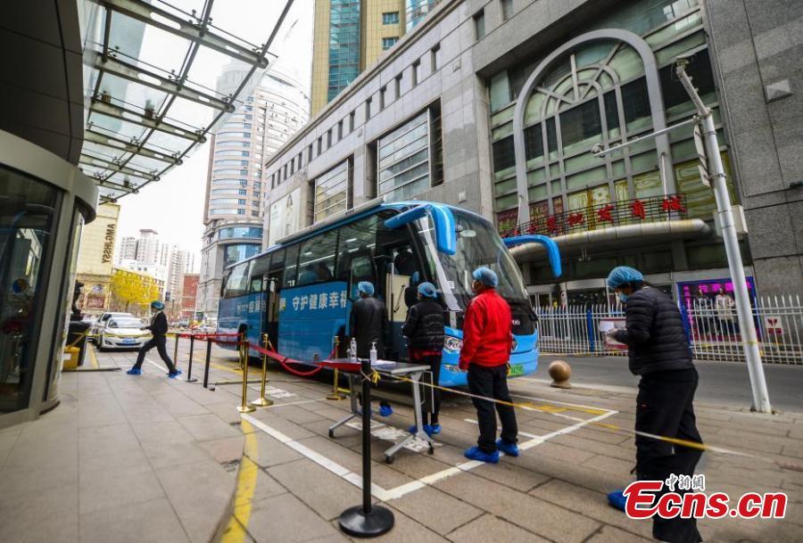 Citizens in Urumqi, northwest China's Xinjiang Uygur Autonomous Region are waiting for COVID-19 vaccines on a mobile vaccination vehicle at a business district, Nov.1, 2021. (Photo: China News Service/Liu Xin)