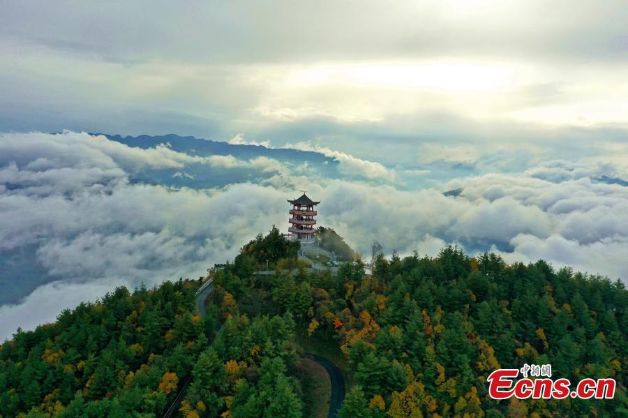 An attic is shrouded with spectacular sea of clouds at Zengjiashan, Guangyuan city, southwest China's Sichuan Province. (Photo: China News Service/Miao Zhiyong)