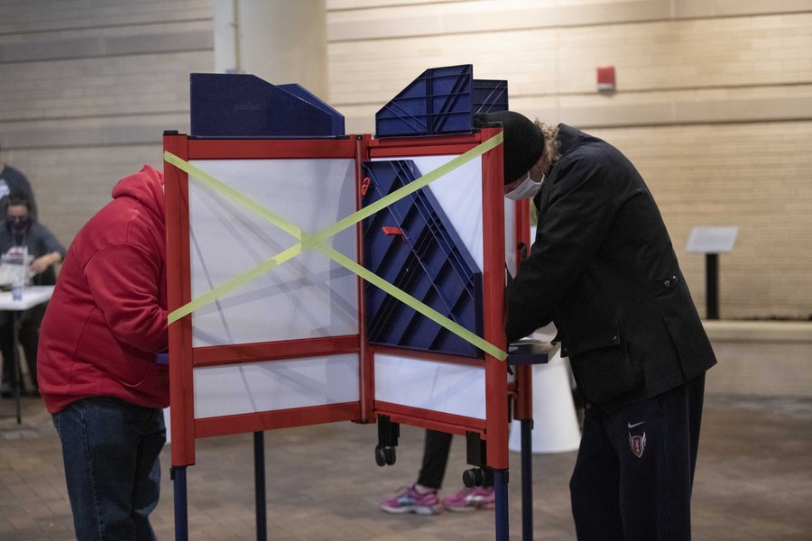 File photo shows voters filling in their ballots at a polling station in Arlington, Virginia, the United States, Nov. 3, 2020. (Xinhua/Liu Jie)