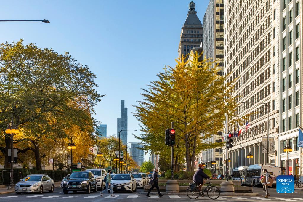 Pedestrians cross Michigan Avenue ablaze with the fall colors in downtown Chicago, the United States, on Nov. 2, 2021. (Photo by Joel Lerner/Xinhua)