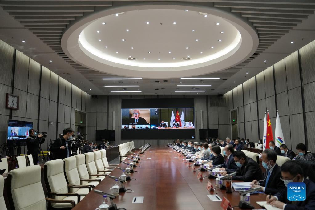 Juan Antonio Samaranch Jr. (on the screen, L), chairman of the International Olympic Committee (IOC) Coordination Committee for Beijing 2022, speaks during the video meeting of the IOC Coordination Commission for the XXIV Olympic Winter Games Beijing 2022 in Beijing, capital of China, Nov. 2, 2021. (Xinhua/Ju Huanzong)