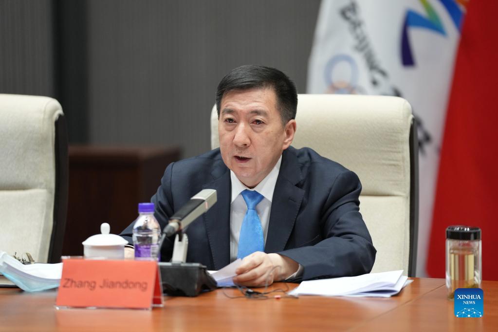 Zhang Jiandong, vice mayor of Beijing and executive vice president of the Beijing 2022 Organizing Committee (BOCOG), speaks during the video meeting of the International Olympic Committee (IOC) Coordination Commission for the XXIV Olympic Winter Games Beijing 2022 in Beijing, capital of China, Nov. 2, 2021. (Xinhua/Ju Huanzong)