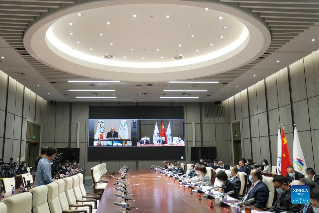 Cai Qi (on the screen, L), secretary of the Communist Party of China Beijing Municipal Committee and president of the Beijing 2022 Organizing Committee (BOCOG), speaks during the video meeting of the International Olympic Committee (IOC) Coordination Commission for the XXIV Olympic Winter Games Beijing 2022 in Beijing, capital of China, Nov. 2, 2021. (Xinhua/Ju Huanzong)