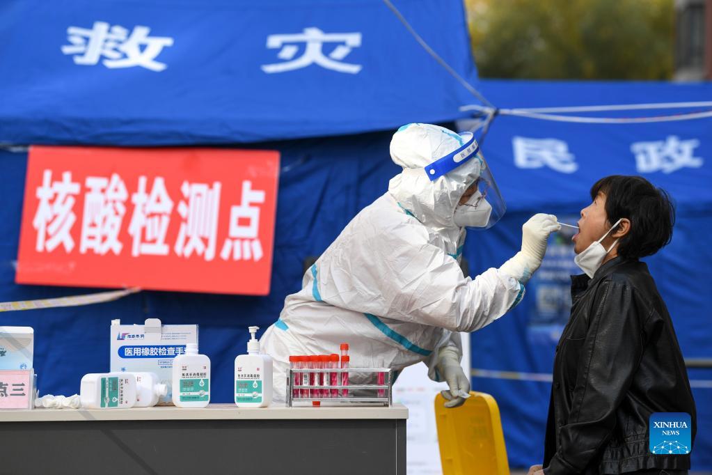 A medical worker takes a swab sample from a resident at a residential area in Xingqing District of Yinchuan, northwest China's Ningxia Hui Autonomous Region, Nov. 2, 2021. A third round of nucleic acid test has been launched from 8 a.m. Tuesday in Yinchuan. As of Sunday, a total of 33 confirmed COVID-19 cases have been reported in Ningxia, with 21 cases in Yinchuan, the capital city. (Xinhua/Feng Kaihua)