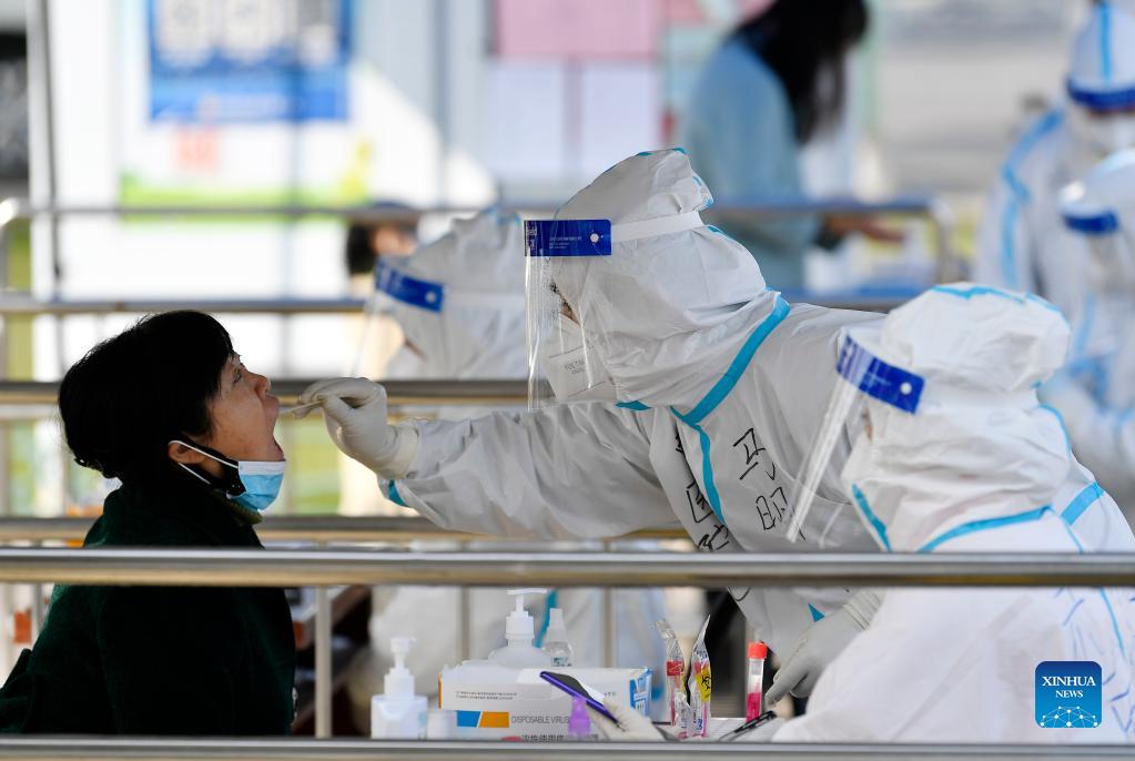 A medical worker takes a swab sample from a citizen in Xingqing District of Yinchuan, northwest China's Ningxia Hui Autonomous Region, Nov. 2, 2021. A third round of nucleic acid test has been launched from 8 a.m. Tuesday in Yinchuan. As of Sunday, a total of 33 confirmed COVID-19 cases have been reported in Ningxia, with 21 cases in Yinchuan, the capital city. (Xinhua/Wang Peng)
