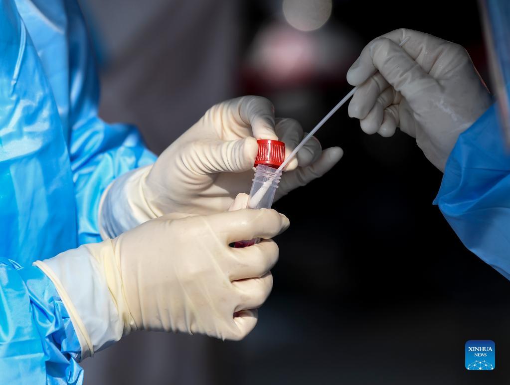 Medical workers put a swab sample into a tube at a testing site in Xingqing District of Yinchuan, northwest China's Ningxia Hui Autonomous Region, Nov. 2, 2021. A third round of nucleic acid test has been launched from 8 a.m. Tuesday in Yinchuan. As of Sunday, a total of 33 confirmed COVID-19 cases have been reported in Ningxia, with 21 cases in Yinchuan, the capital city. (Xinhua/Feng Kaihua)