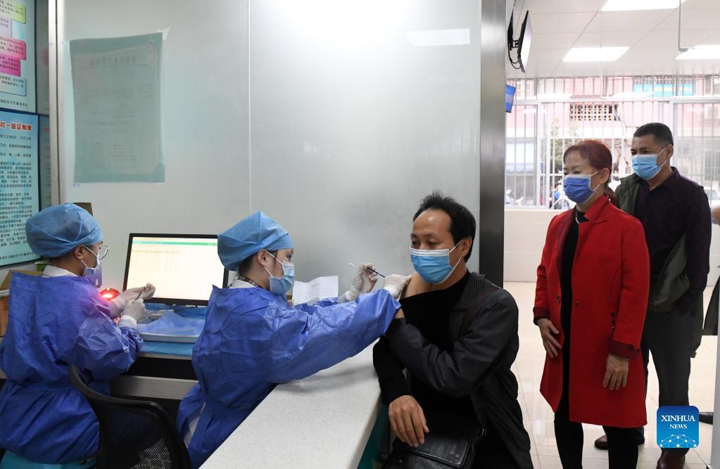 A resident gets a booster shot of the COVID-19 vaccine at a community medical service center in Qingxiu District of Nanning, south China's Guangxi Zhuang Autonomous Region, Nov. 2, 2021. (Xinhua/Lu Boan)