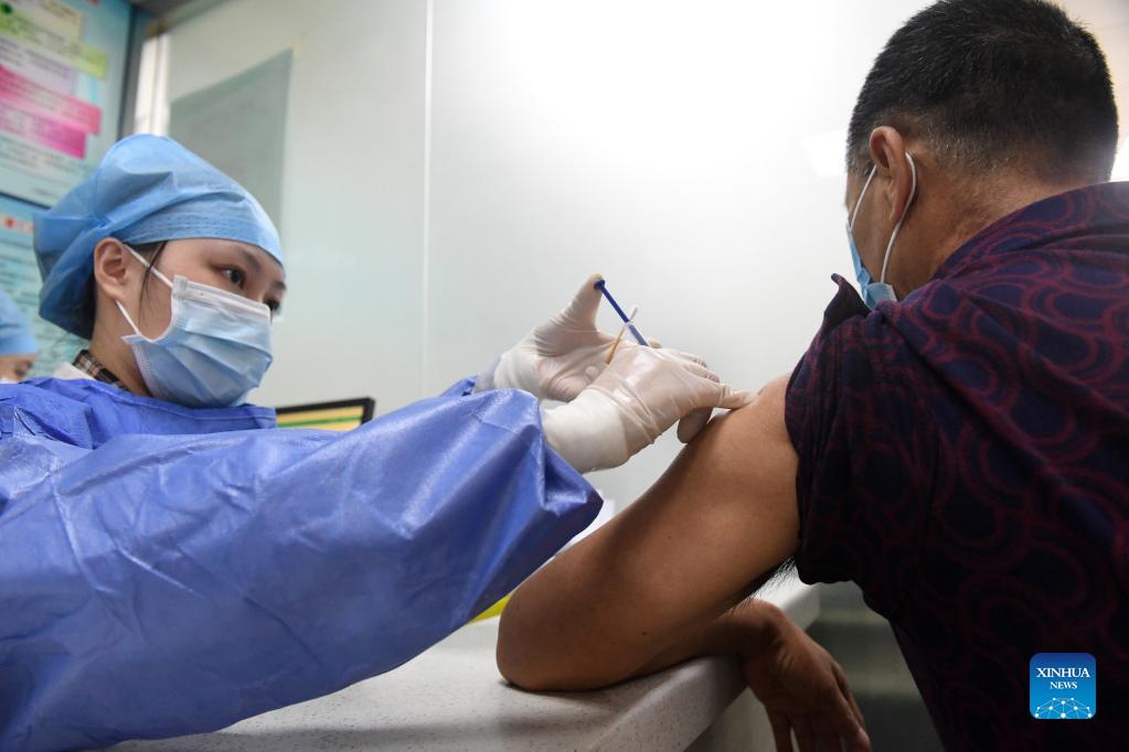 A resident gets a booster shot of the COVID-19 vaccine at a community medical service center in Qingxiu District of Nanning, south China's Guangxi Zhuang Autonomous Region, Nov. 2, 2021. (Xinhua/Lu Boan)