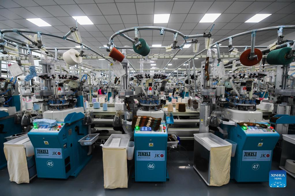 Photo taken on Nov. 2, 2021 shows a sock factory equipped with intelligent devices and digitalized system in Zhuji, east China's Zhejiang Province. Local authorities in Zhuji, a major sock manufacturing base, have stepped up diversified financial support to develop sock industry and promote industrial upgrading. (Xinhua/Xu Yu)