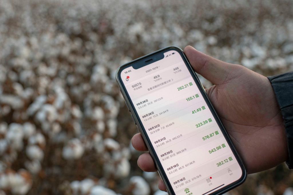 Lu Dewen, son of cotton farmer Lu Gaolin, shows previous task data of unmanned aerial vehicle (UAV) in Shawan City, northwest China's Xinjiang Uygur Autonomous Region, Oct. 19, 2021. The family bought an UAV this August to help spray defoliant. Lu Gaolin, a cotton farmer, is 56 years old and lives in Shawan City of Xinjiang Uygur Autonomous Region. The cotton harvest season in Xinjiang, China's largest cotton-producing region, will last until mid-November this year, with the output expected to reach 5.2 million tonnes. The region has contributed nearly 90 percent of China's cotton production capacity and about 20 percent of the global cotton production. In four days, Lu Gaolin completely finished harvesting his 64-hectare cotton field thanks to a gigantic green machine. The cotton picker is way more efficient than manual labor. "It used to take seven or eight workers over two months to complete the job of manually picking cotton," he said. Furthermore, new methods such as machine seeding and drone spraying have greatly improved farm work efficiency and quality. After this picking season, Lu and his son Dewen have bigger plans for the coming year. They intend to purchase a new cotton picker worth about 940,000 U.S. dollars together with other cotton farmers in order to increase their income. (Xinhua/Hu Huhu)