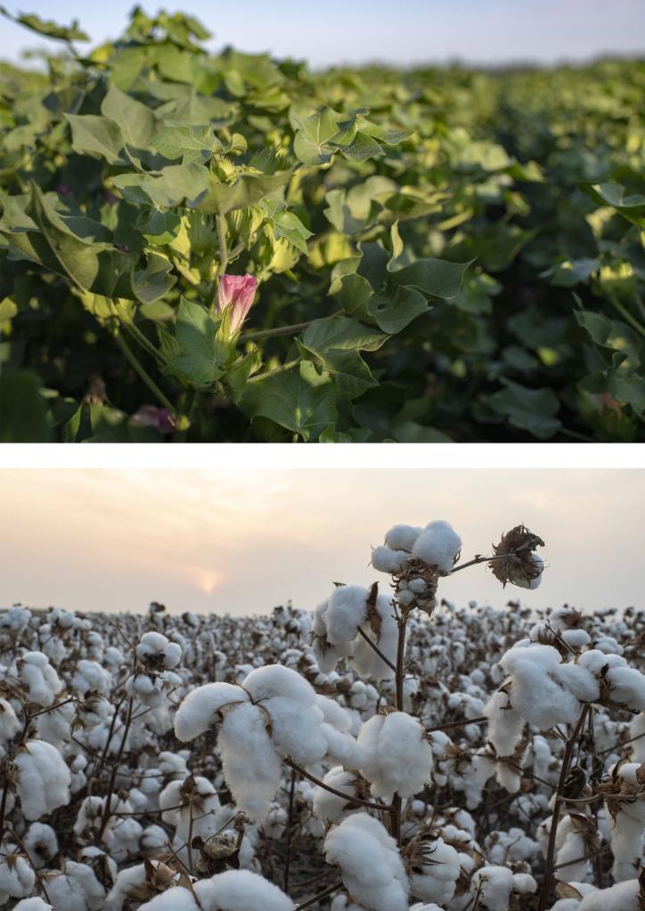 Combo photo shows cottons in Lu Gaolin's cotton fields on July 15, 2021 (top) and on Oct. 19, 2021, respectively, in Shawan City, northwest China's Xinjiang Uygur Autonomous Region. Lu Gaolin, a cotton farmer, is 56 years old and lives in Shawan City of Xinjiang Uygur Autonomous Region. The cotton harvest season in Xinjiang, China's largest cotton-producing region, will last until mid-November this year, with the output expected to reach 5.2 million tonnes. The region has contributed nearly 90 percent of China's cotton production capacity and about 20 percent of the global cotton production. In four days, Lu Gaolin completely finished harvesting his 64-hectare cotton field thanks to a gigantic green machine. The cotton picker is way more efficient than manual labor. "It used to take seven or eight workers over two months to complete the job of manually picking cotton," he said. Furthermore, new methods such as machine seeding and drone spraying have greatly improved farm work efficiency and quality. After this picking season, Lu and his son Dewen have bigger plans for the coming year. They intend to purchase a new cotton picker worth about 940,000 U.S. dollars together with other cotton farmers in order to increase their income. (Xinhua/Hu Huhu)