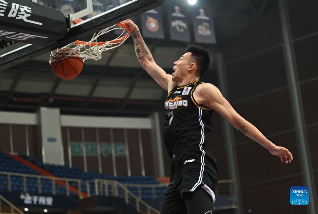 Zhang Zhenlin of Liaoning Flying Leopards dunks during the 8th round match between Liaoning Flying Leopards and Ningbo Rockets at the 2021-2022 season of the Chinese Basketball Association (CBA) league in Zhuji, east China's Zhejiang Province, Nov. 2, 2021. (Xinhua/Chen Xinbo)