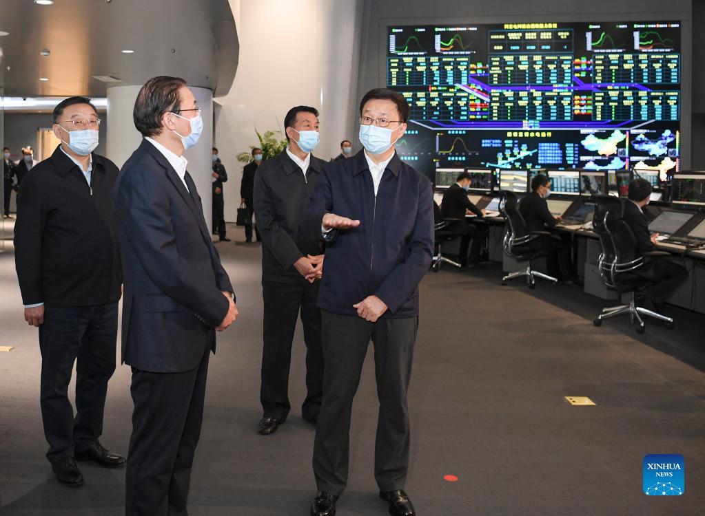 Chinese Vice Premier Han Zheng, also a member of the Standing Committee of the Political Bureau of the Communist Party of China Central Committee, visits the National Electric Power Dispatching and Control Center before a symposium at the State Grid Corporation of China, Nov. 2, 2021. Han made an inspection trip to the State Grid Corporation of China and chaired a symposium on Tuesday. (Xinhua/Yin Bogu)