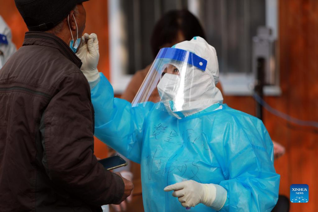 A medical worker takes a swab sample from a villager for COVID-19 nucleic acid test in Dongguan Village of Shenze County, Shijiazhuang, north China's Hebei Province, Nov. 2, 2021. Shijiazhuang has activated an emergency response mechanism, with temporary prevention and control measures put in place in regions such as Shenze County and Jinzhou City. Two locally transmitted COVID-19 cases were reported in Shijiazhuang between 4 p.m. Monday and 11 a.m. Tuesday. (Photo by Zhai Haijing/Xinhua)
