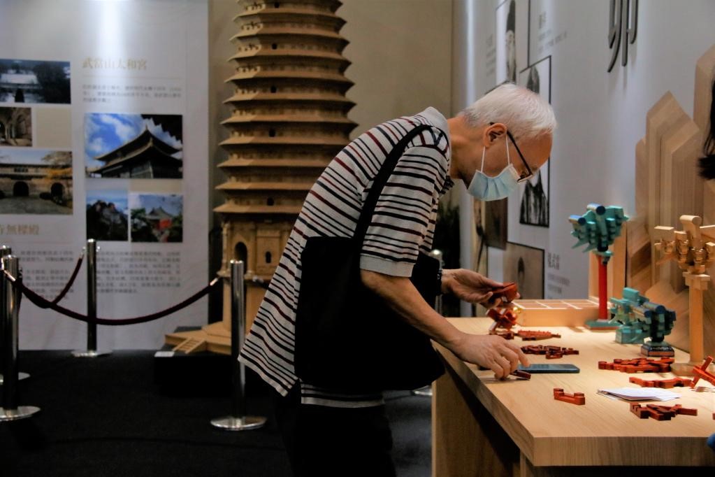 A Hong Kong resident makes a model with mortises and tenons at a thematic exhibition on the history of Chinese architecture and the achievements of China’s construction industry at the Hong Kong Convention and Exhibition Centre, Oct. 26. (Photo/Xinhua)