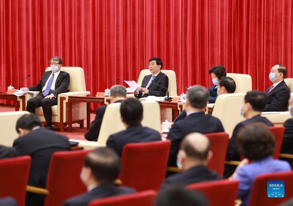 Wang Huning, a member of the Standing Committee of the Political Bureau of the Communist Party of China (CPC) Central Committee and a member of the Secretariat of the CPC Central Committee, attends a symposium marking the 90th anniversary of the founding of the Chinese Soviet Republic and the central revolutionary base in Beijing, capital of China, Nov. 2, 2021. (Xinhua/Ding Lin)