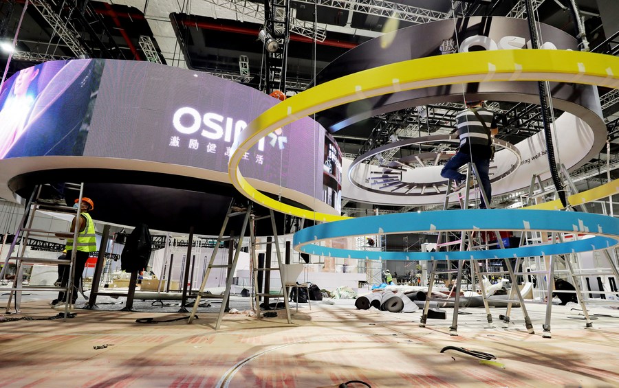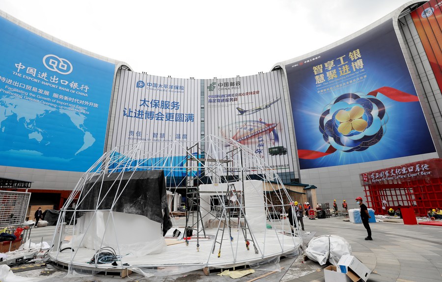 Workers build a pavilion at the National Exhibition and Convention Center (Shanghai), a main venue for the fourth China International Import Expo (CIIE), in east China's Shanghai, Oct. 29, 2021. The 4th CIIE is set to take place in Shanghai from Nov. 5 to 10. (Xinhua/Fang Zhe)