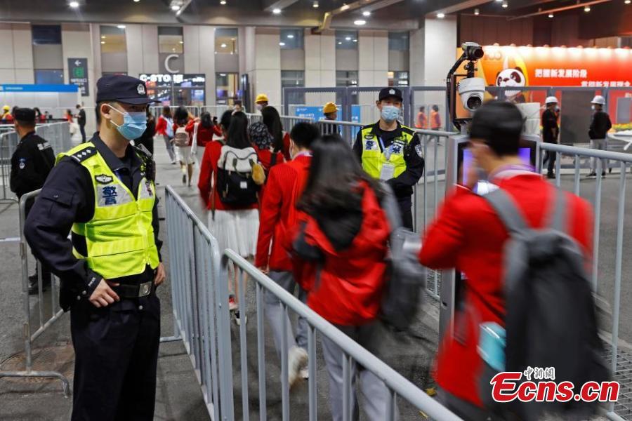 Staff members exited the venue in Shanghai, Nov.2, 2021. (Photo: China News Service/Yin Liqin)