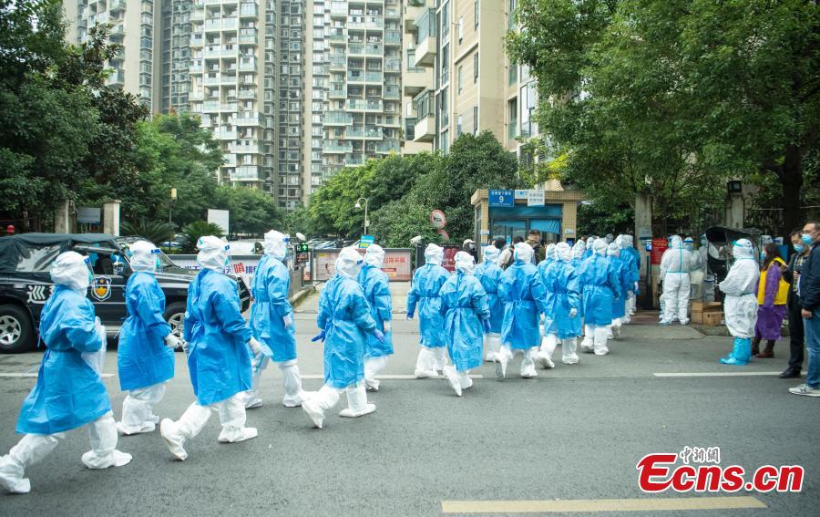Medical staffs queue up for entering a residential community reporting one COVID-19 case, to conduct new rounds of nucleic acid testings in Chengdu, southwest China's Sichuan Province, Nov.2, 2021. (Photo: China News Service/Liu Zhongjun)