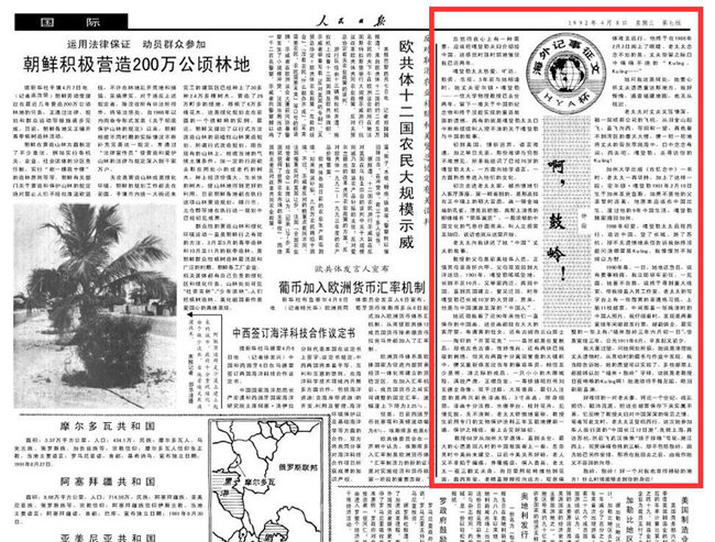 Photo shows an article entitled “Ah! Guling” about the touching story of the American couple’s journey to find Guling, which was published by People’s Daily on April 8, 1992.