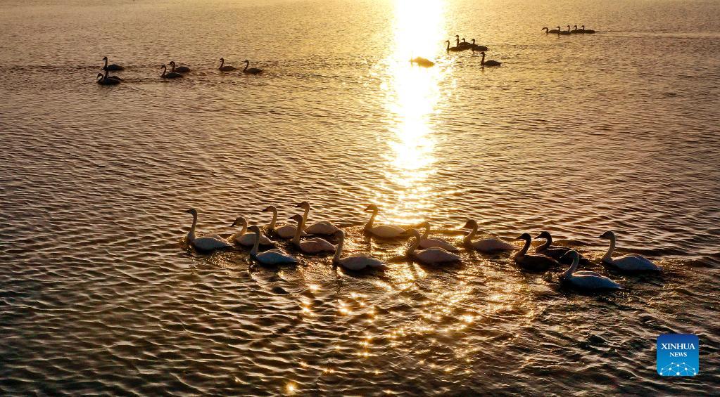 Aerial photo taken on Nov. 3, 2021 shows a flock of swans swimming on the lake of the Hongjiannao Wetland Reserve in Shenmu, northwest China's Shaanxi Province. Flocks of wintering wild geese and swans have arrived at the Hongjiannao Wetland Reserve on their route of migration. (Xinhua/Tao Ming)