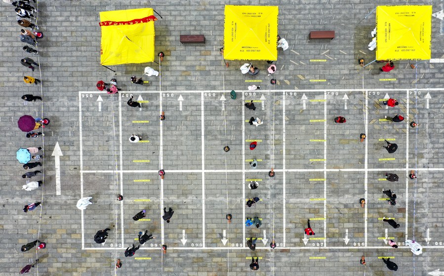Aerial photo taken on Oct. 27, 2021 shows residents waiting in lines for COVID-19 nucleic acid testing at a sampling site in Yinchuan, northwest China's Ningxia Hui Autonomous Region. (Xinhua/Feng Kaihua)
