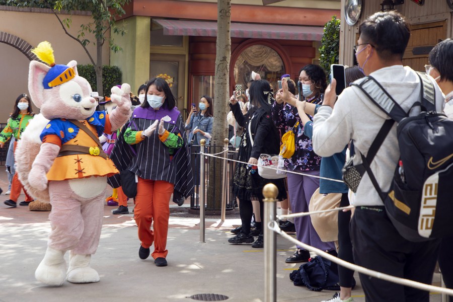 A staff member dressed as LinaBell waves to visitors at Shanghai Disney Resort, which has reopened after a temporary closure for epidemic prevention and control work, in east China's Shanghai, Nov. 3, 2021. (Xinhua)