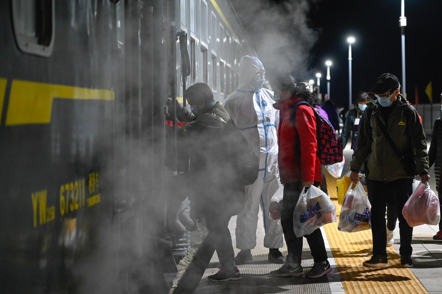 Tourists stranded due to a COVID-19 outbreak get on a train at Ejina Railway Station in Ejina Banner of Alxa League, north China's Inner Mongolia Autonomous Region, Oct. 27, 2021. (Xinhua/He Shuchen)