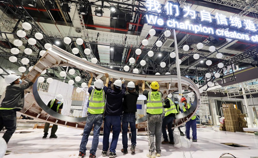 Workers build a pavilion at the National Exhibition and Convention Center (Shanghai), a main venue for the fourth China International Import Expo (CIIE), in east China's Shanghai, Oct. 29, 2021. (Xinhua/Fang Zhe)