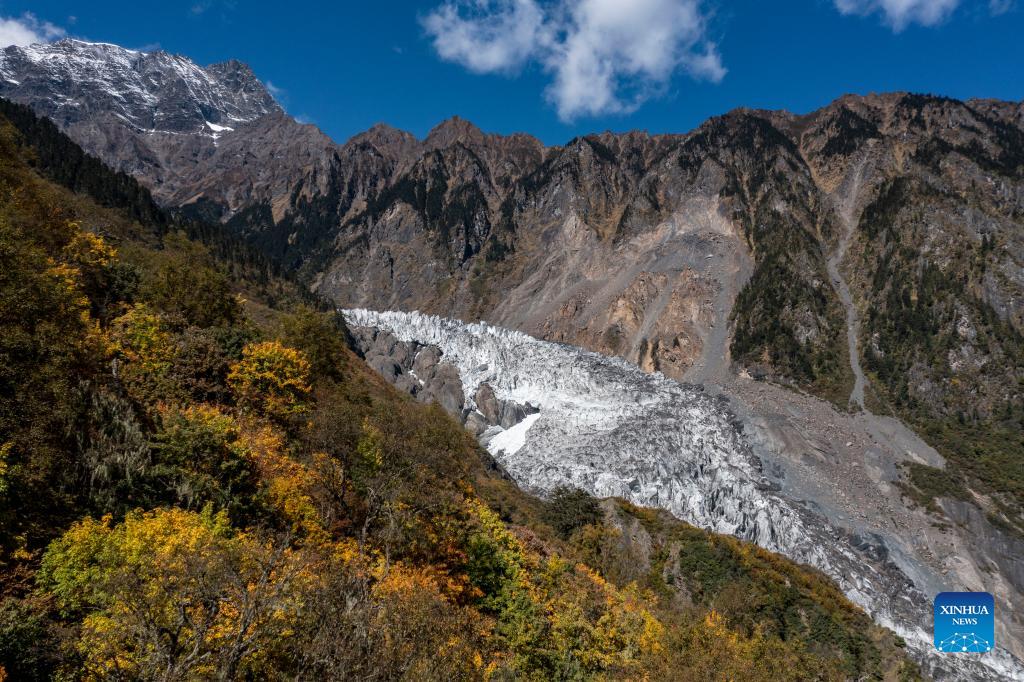 Aerial photo taken on Oct. 28, 2021 shows a view of the Mingyong Glacier and a primordial forest in Deqen Tibetan Autonomous Prefecture, southwest China's Yunnan Province. The Mingyong Glacier, located on the east slope of the Meili Snow Mountains, is one of the world's few low-latitude glaciers. (Xinhua/Jiang Wenyao)