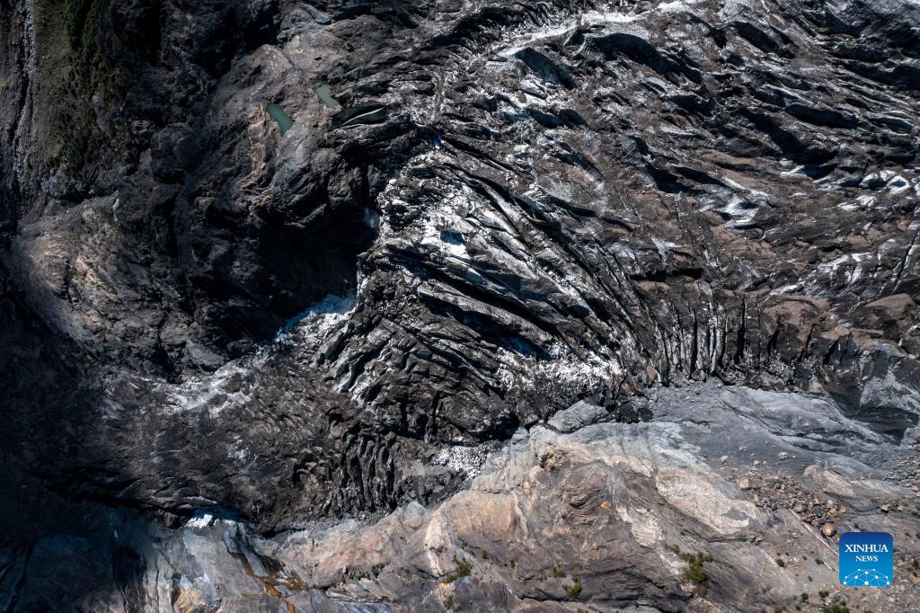 Aerial photo taken on Oct. 28, 2021 shows a view of the Mingyong Glacier in Deqen Tibetan Autonomous Prefecture, southwest China's Yunnan Province. The Mingyong Glacier, located on the east slope of the Meili Snow Mountains, is one of the world's few low-latitude glaciers. (Xinhua/Jiang Wenyao)