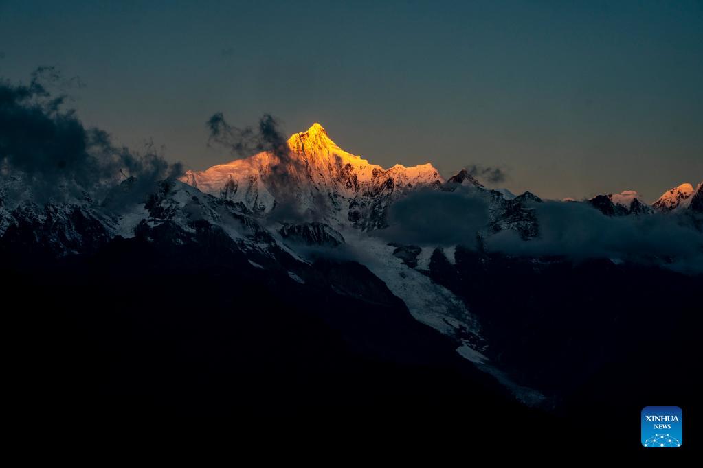 Aerial photo taken on Oct. 28, 2021 shows a view of the Mingyong Glacier and the main peak of the Meili Snow Mountains in Deqen Tibetan Autonomous Prefecture, southwest China's Yunnan Province. The Mingyong Glacier, located on the east slope of the Meili Snow Mountains, is one of the world's few low-latitude glaciers. (Xinhua/Jiang Wenyao)