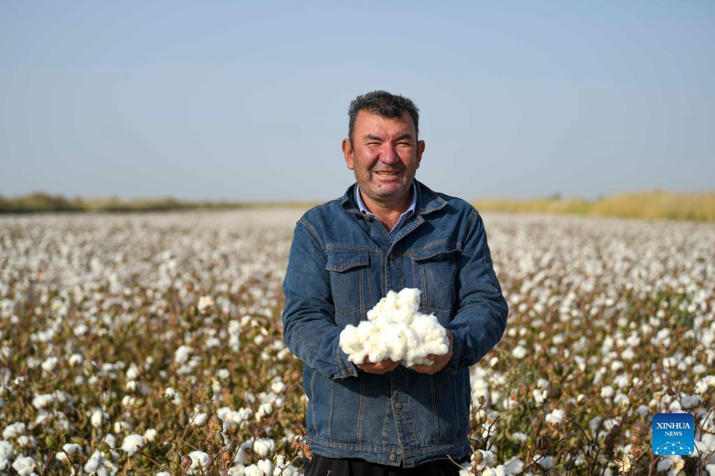 Erkin Rehim shows cotton harvested in Yuli County, northwest China's Xinjiang Uygur Autonomous Region, Oct. 15, 2021. Erkin Rehimc began growing cotton in 2004 and has benefited from agricultural mechanization since 2017. The cotton farmer, 49, uses cotton pickers to harvest his 550 mu (about 90.6 acres) of cotton fields in 24 hours. (Xinhua/Zhao Ge)