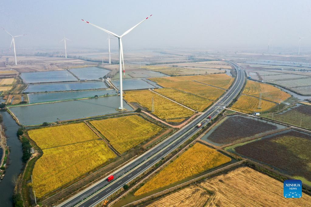 Aerial photo taken on Nov. 3, 2021 shows a wind power field in Luduo Township of Baoying County of Yangzhou, east China's Jiangsu Province. Baoying County of Yangzhou has been boosting green development by promoting solar and wind energy in recent years. The county's annual power generation from clean energy now reaches 2.1 billion kWh, accounting for 84 percent of the county's annual electricity consumption, equivalent to reducing coal consumption by 840,000 tonnes. (Xinhua/Li Bo)