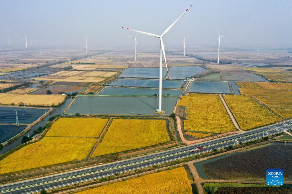 Aerial photo taken on Nov. 3, 2021 shows a wind power field in Luduo Township of Baoying County of Yangzhou, east China's Jiangsu Province. Baoying County of Yangzhou has been boosting green development by promoting solar and wind energy in recent years. The county's annual power generation from clean energy now reaches 2.1 billion kWh, accounting for 84 percent of the county's annual electricity consumption, equivalent to reducing coal consumption by 840,000 tonnes. (Xinhua/Li Bo)