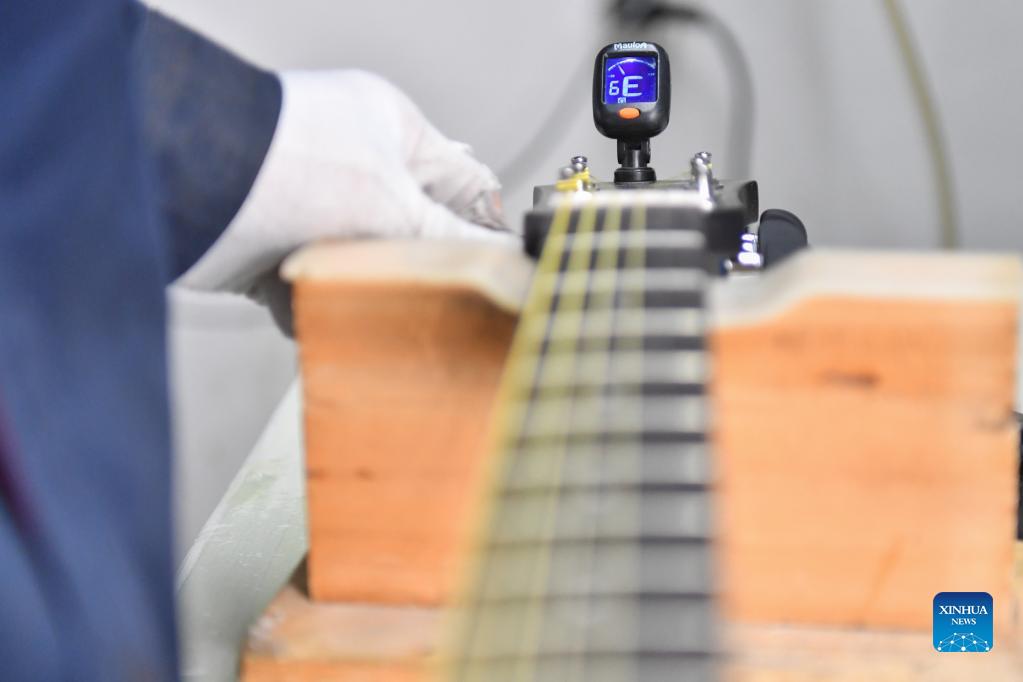 A worker checks if the guitar is in tune at a guitar manufacturer in Dong'an County, central China's Hunan Province, Nov. 3, 2021. Dong'an County has in recent years taken steps to boost guitar industry with the aim to build a "guitar town". More than 400 people were offered job opportunities thanks to the booming guitar business. At present, guitars made in the county are exported to 15 countries and regions. The guitar industry has become a new name card of the county. (Xinhua/Chen Zeguo)