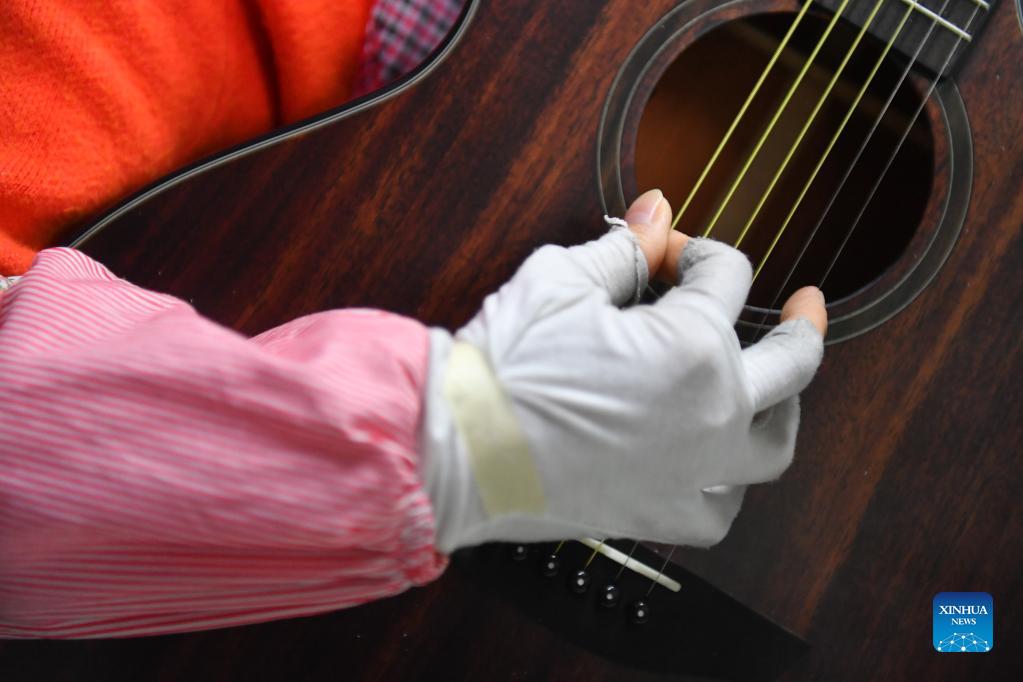 A worker tunes a guitar at a guitar manufacturer in Dong'an County, central China's Hunan Province, Nov. 3, 2021. Dong'an County has in recent years taken steps to boost guitar industry with the aim to build a "guitar town". More than 400 people were offered job opportunities thanks to the booming guitar business. At present, guitars made in the county are exported to 15 countries and regions. The guitar industry has become a new name card of the county. (Xinhua/Chen Zeguo)