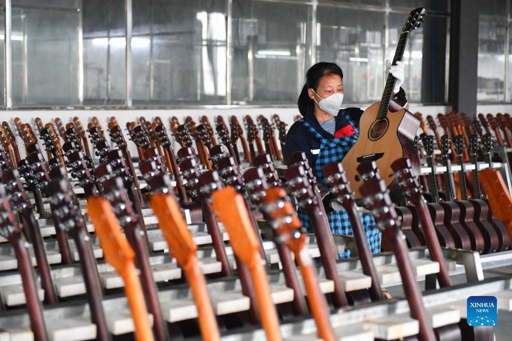 A worker checks a guitar at a guitar manufacturer in Dong'an County, central China's Hunan Province, Nov. 3, 2021. Dong'an County has in recent years taken steps to boost guitar industry with the aim to build a "guitar town". More than 400 people were offered job opportunities thanks to the booming guitar business. At present, guitars made in the county are exported to 15 countries and regions. The guitar industry has become a new name card of the county. (Xinhua/Chen Zeguo)