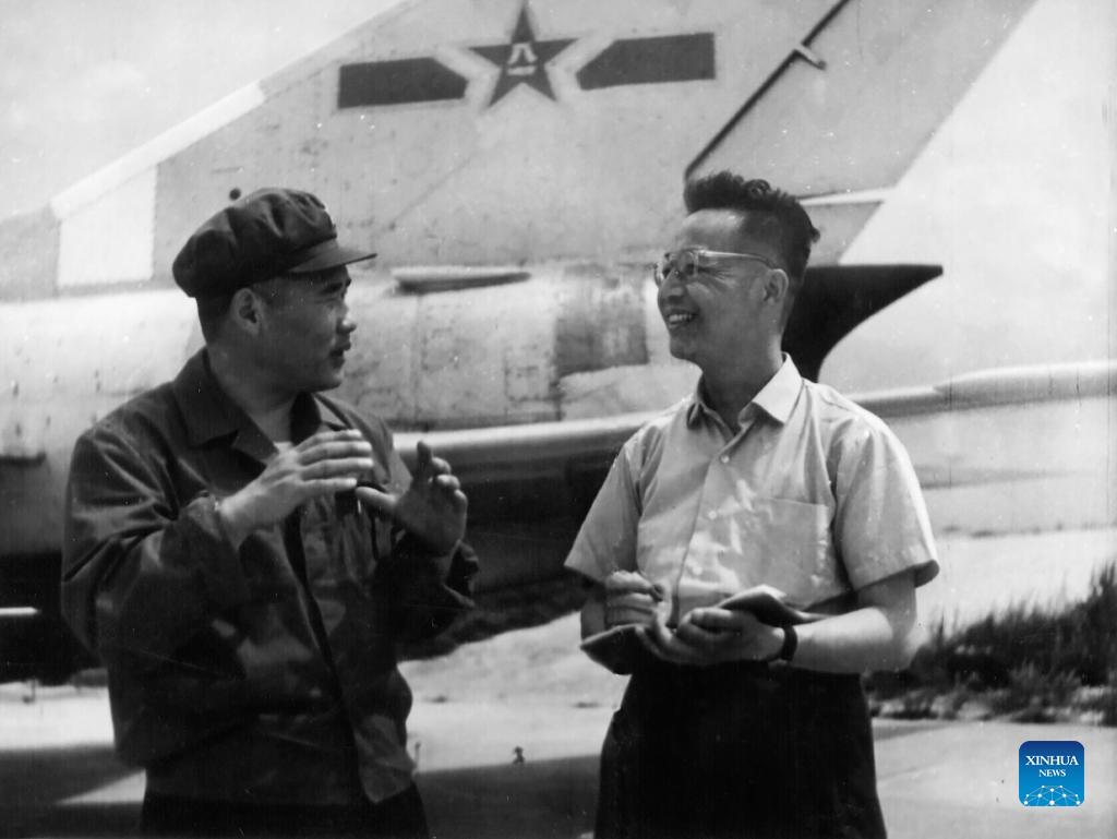 In this undated file photo, Gu Songfen (R) has a discussion with his colleague Lu Mingdong by an aircraft. Gu Songfen, winner of China's top science award, is an aircraft designer at the Aviation Industry Corporation of China, Ltd. (AVIC), the nation's leading aircraft maker. Born in 1930, Gu is an academician at both the Chinese Academy of Sciences (CAS) and the Chinese Academy of Engineering. Leading the development of China's J-8 and J-8 II fighter jets, Gu has made contributions to the country's advancement in aviation weaponry and equipment. (Xinhua)