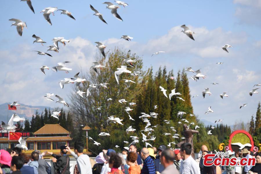 Flying red-beaked gulls along with visitors are screened in the same photo at Haigeng Dam in Kunming, southwest China's Yunnan Province, Nov.3, 2021. (Photo: China News Service/Liu Ranyang)