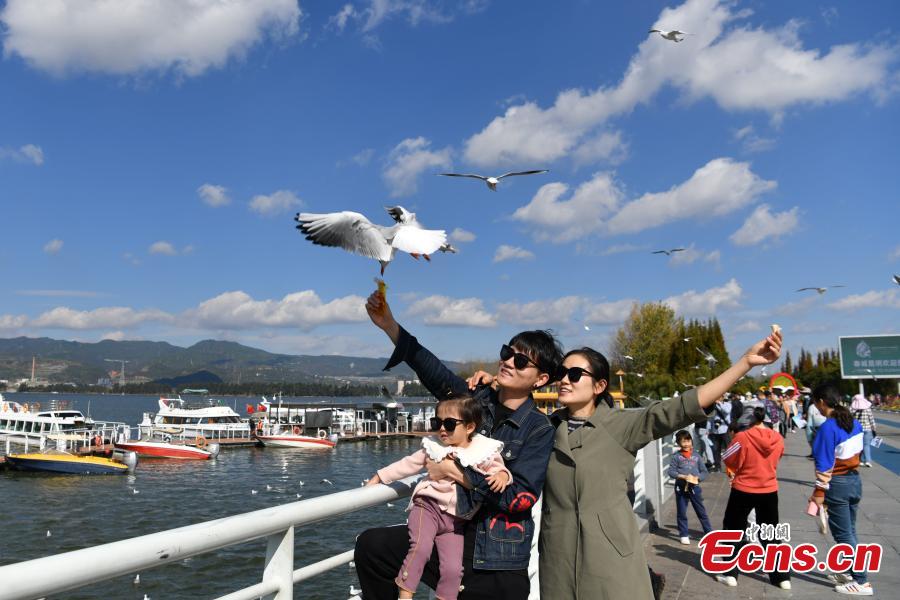 Tourists and citizens watch and feed the red-beaked gulls at Haigeng Dam in Kunming, southwest China's Yunnan Province, Nov.3, 2021. (Photo: China News Service/Liu Ranyang)