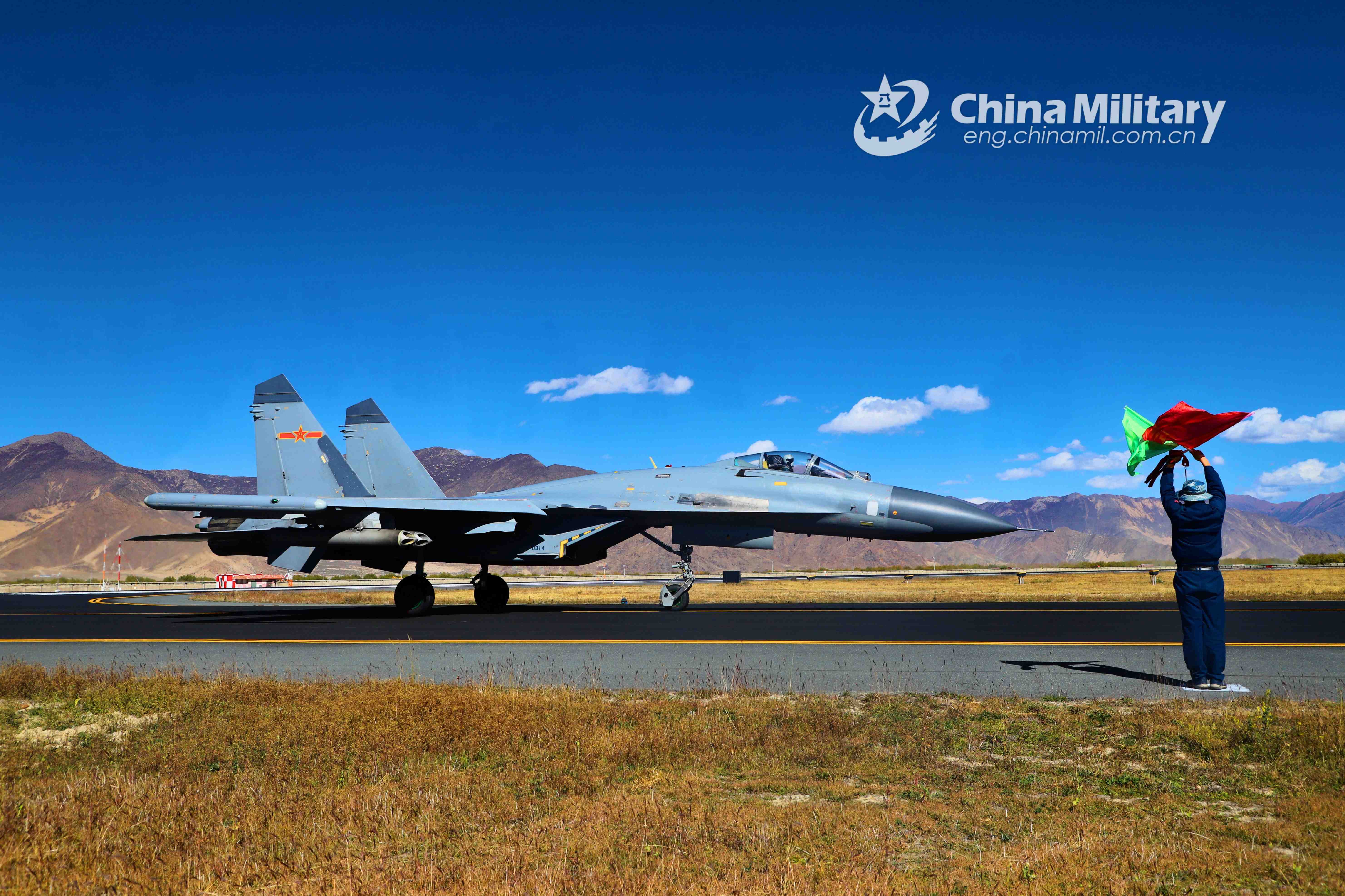 A ground crew member assigned to an aviation brigade of the air force under the PLA Western Theater Command uses flag signals to guide a fighter jet before its taking-off for flight training on October 26, 2021. (eng.chinamil.com.cn/Photo by Wen Rui)