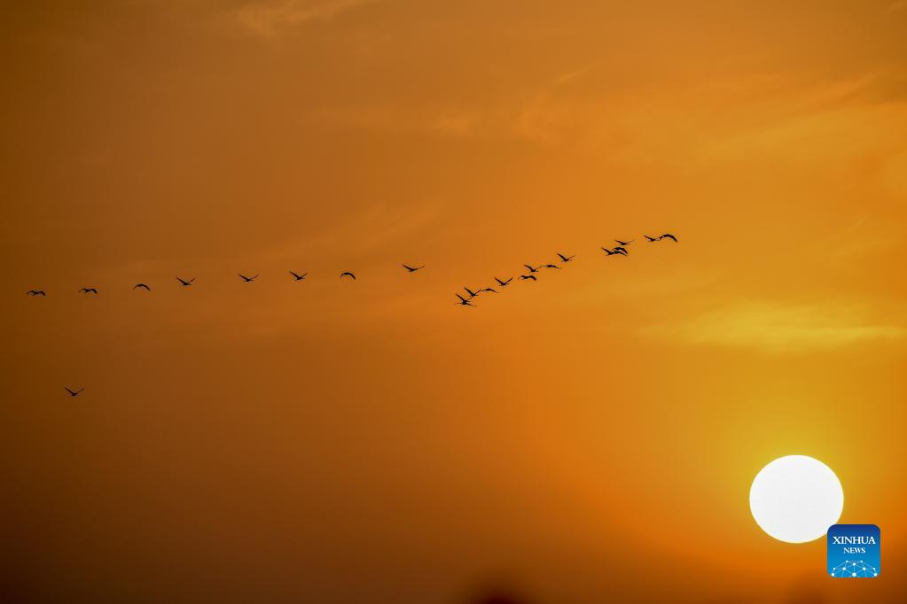 Migrant birds fly over Momoge National Nature Reserve in Zhenlai County, Baicheng City of northeast China's Jilin Province, Nov. 4, 2021. (Xinhua/Zhang Nan)